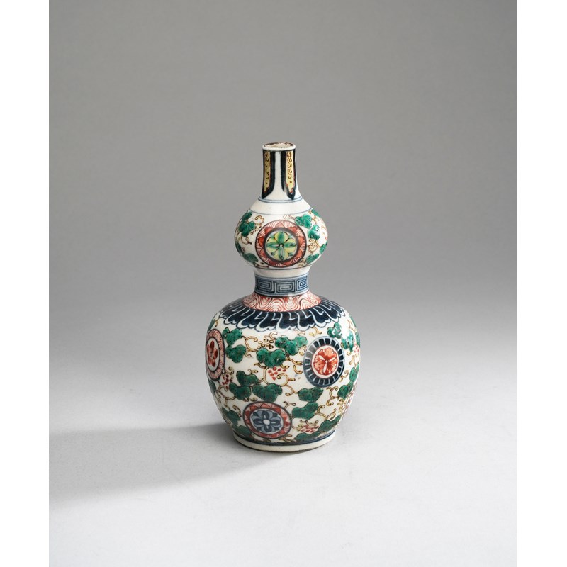 The double-gourd body decorated in underglaze blue and polychrome enamels, painted with floral roundels reminiscent of mon amongst scrolling vines and formal borders, 17.5cm.
