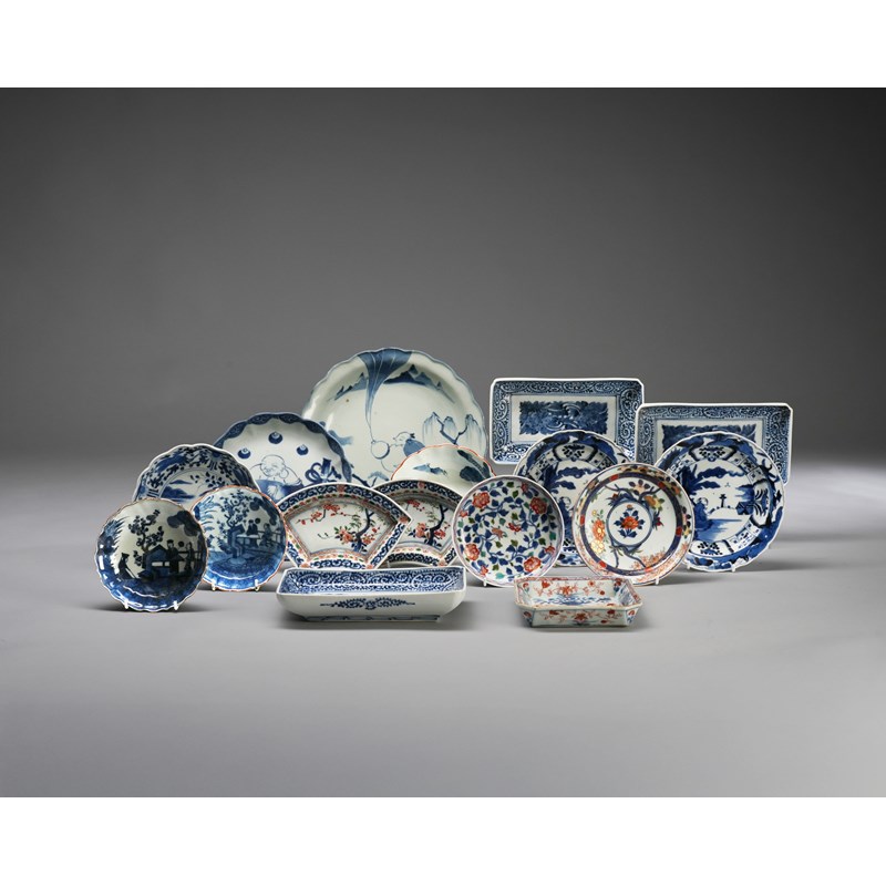 Comprising: eleven blue and white dishes, including a set of three rectangular dishes with karakusa scrolls and peonies, and five dishes with polychrome decoration; all variously decorated with birds, flowers, auspicious symbols, scholars in gardens and legendary figures, 27.2cm max. (16)