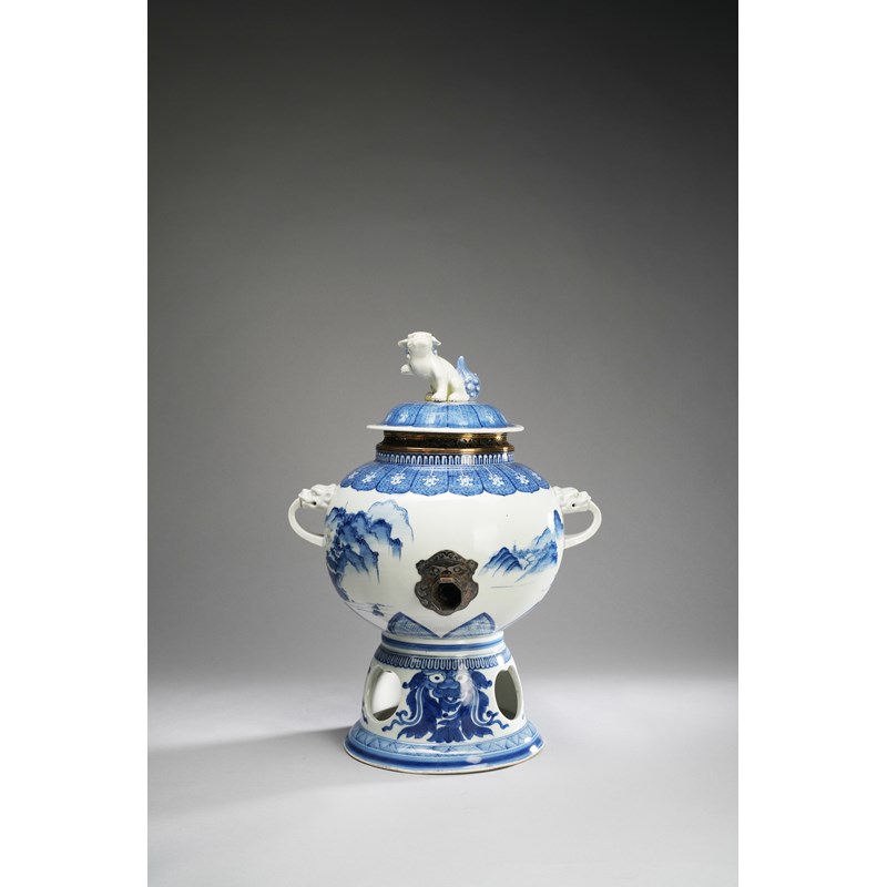 The bulbous body raised on a tall foot with pierced openwork decoration, decorated all over in underglaze blue, with mythical beasts' masks to the foot, an extensive mountainous river landscape to the body and formal lappets repeated on the cover; with two shishi-head handles to the sides and another lion dog to the top, depicted seated with its paw raised; with a silver mask-shaped spout and a reticulated band to the rim; 45cm. (2)
