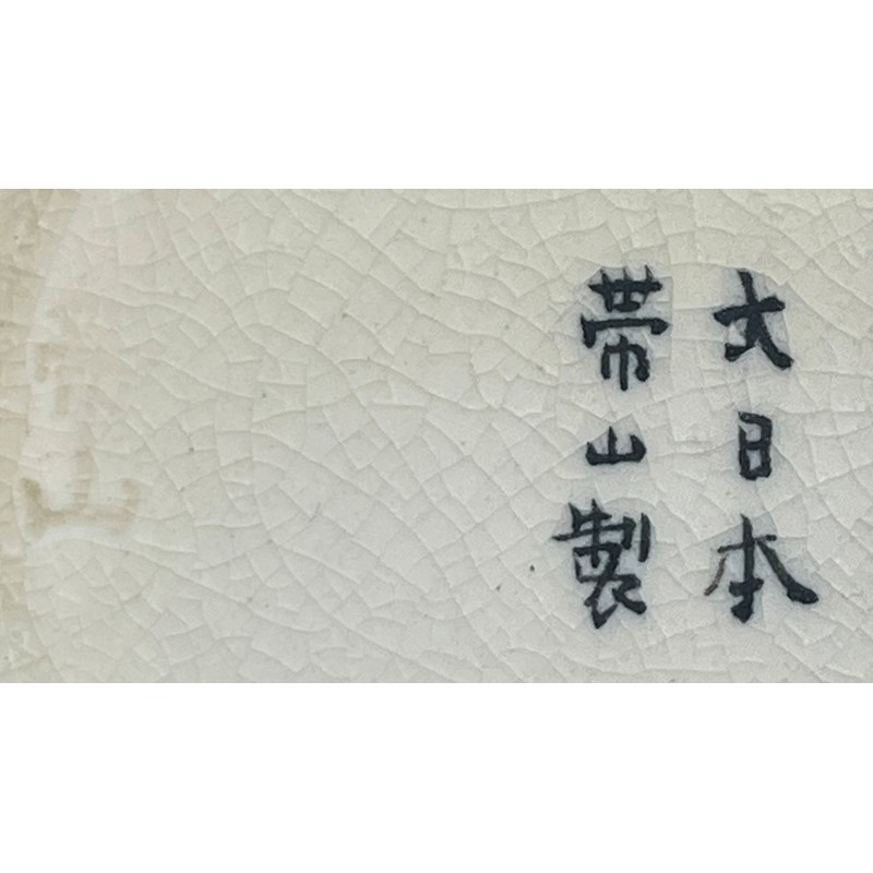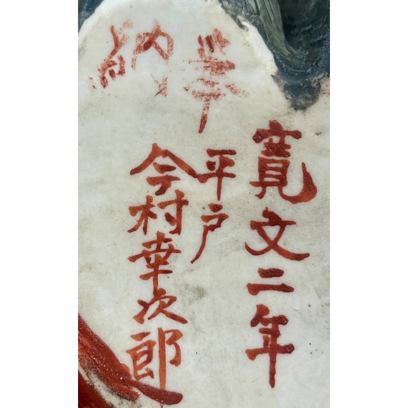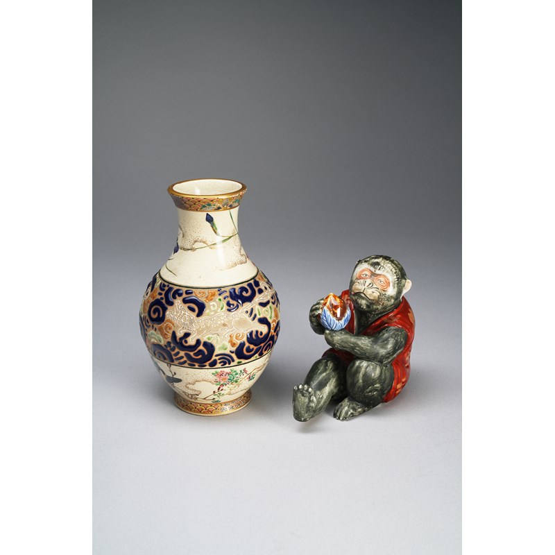Decorated with shishi and waves in between borders of birds and flowers, insects and brocade patterns, the base signed Dai Nihon Taizan zo and impressed Taizan, 21cm; and a Hirado okimono of a monkey holding a peach, inscribed Hono, Kanbun ninen, Hirado, Imamura Kojiro (Dedicated by Imamura Kojiro, Kanbun 2nd year, 1662, Hirado), 15.5cm. (2)