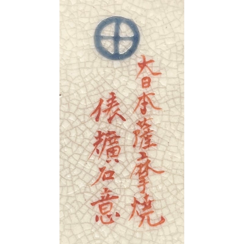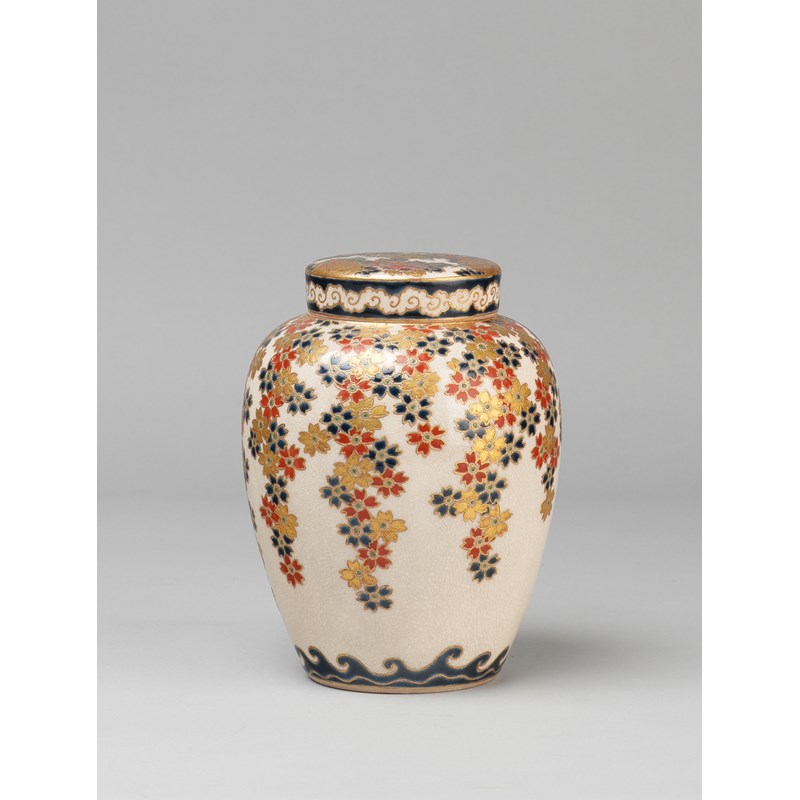 The ovoid body decorated with trailing cherry blossoms over stylised waves, the lid with peonies and scrolling clouds, the base signed Dai Nihon Satsuma, Hyokoseki-i, 16.5cm. (2)