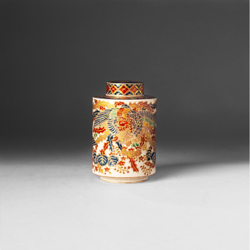 The cylindrical body typically decorated in thick polychrome enamels and gilt, with two ho-o birds in flight amongst paulownia mon, the lid with mitsu-tomoe (three-comma designs); the base signed Dai Nihon Satsuma yaki, Hyakushu beniga (Hyaku/ Momo Shuko), 14.3cm. (2)