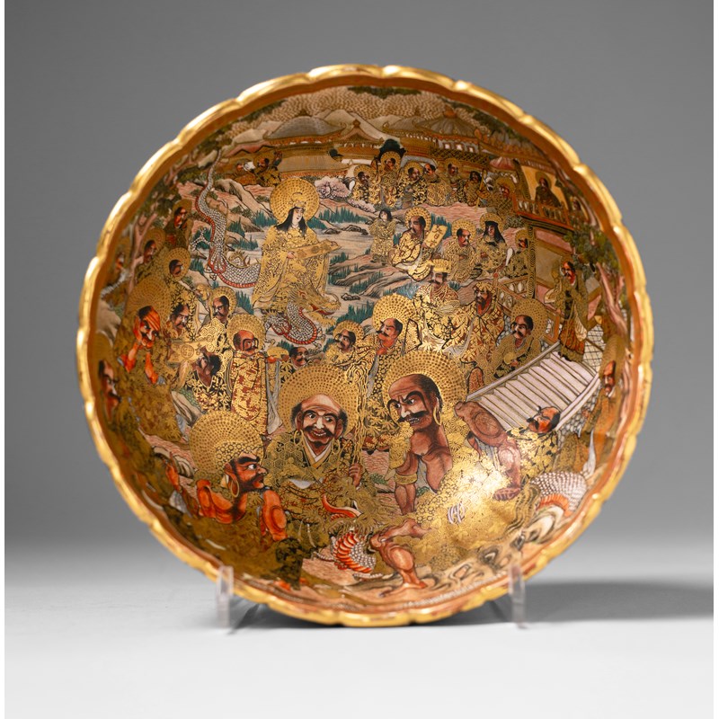 Richly decorated inside and out with many rakan and other Immortals in a heavenly city, one holding a scroll inscribed Dai Nihon Satsuma yaki, Minako Sanjo Shirakawa-bashi, framed by brocade patterns and Shimazu mon; the base signed Dai Nihon Satsuma yaki, Kusube zo, 24.3cm.