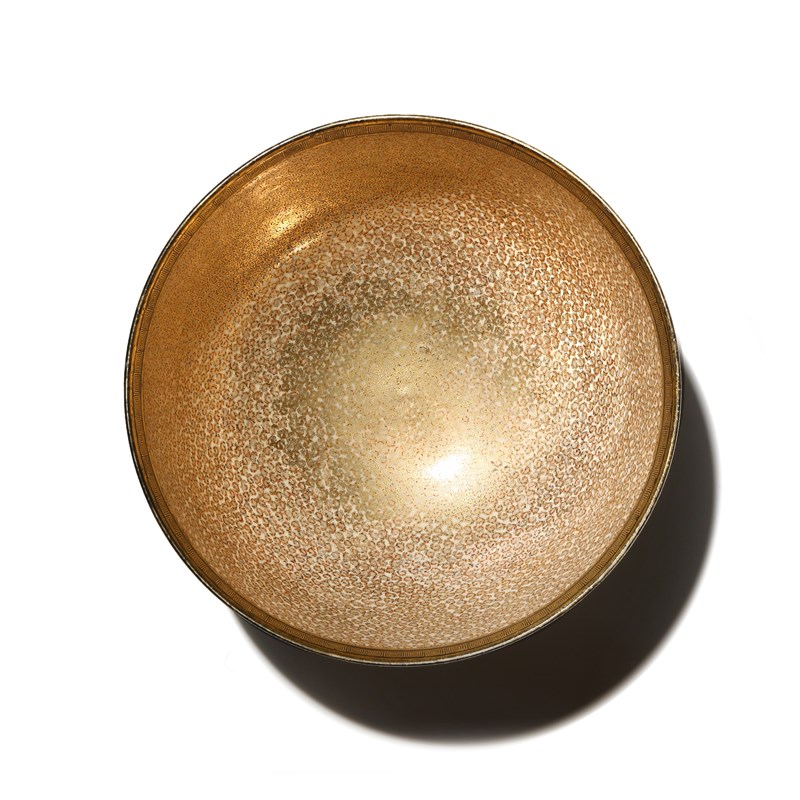 The deep U-shaped body raised on a short foot and decorated in gilt and polychrome enamels, the well delicately painted with a kaleidoscope of hundreds of butterflies fluttering all over the surface, the inner rim with a band of key fret and shippo-tsunagi cash to the reverse, the outside with a continuous decoration of many flowers, chrysanthemum, peony, hibiscus and irises above a swarm of insects including crickets, cicadas, flies and fireflies, a band of lappets and further shippo-tsunagi above the foot, the base signed Dai Nihon Kyoro fu Ryuzan tsukuru, 23cm dia.
