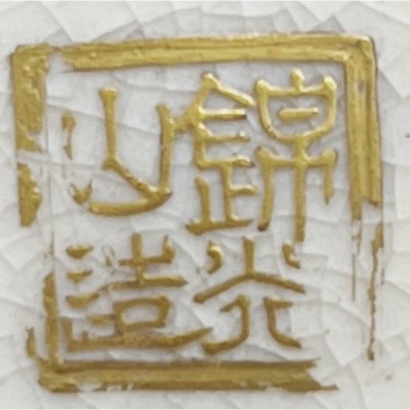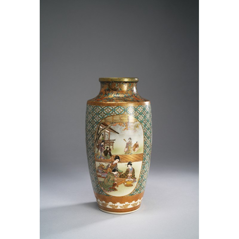 The baluster body richly decorated with three large roundels enclosing many figures, one with a beauty playing the flute to a group of small children, another with dancers and the third with ladies playing go; all reserved on a dense ground of coin diaper, between bands of flowers, butterflies, key fret and other geometric designs; the base signed in gilt and impressed Kinkozan zo, 30.5cm.