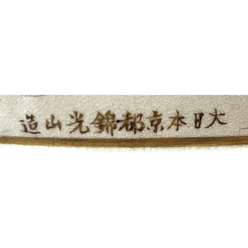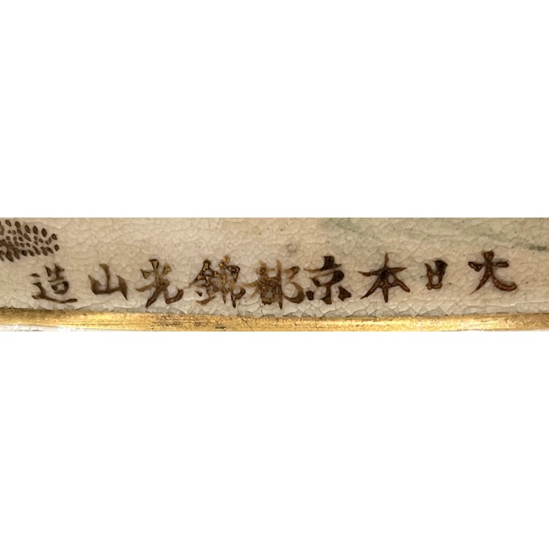 The tall bodies decorated with bands of dense designs including sparrows, flowers, brocade patterns, and views of bridges underneath pine trees, one with a figure on a raft; with moulded rings and bamboo leaves rendered in relief; each vase signed horizontally Dai Nihon Kyoto Kinkozan zo, both 33cm. (2)
