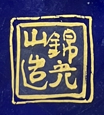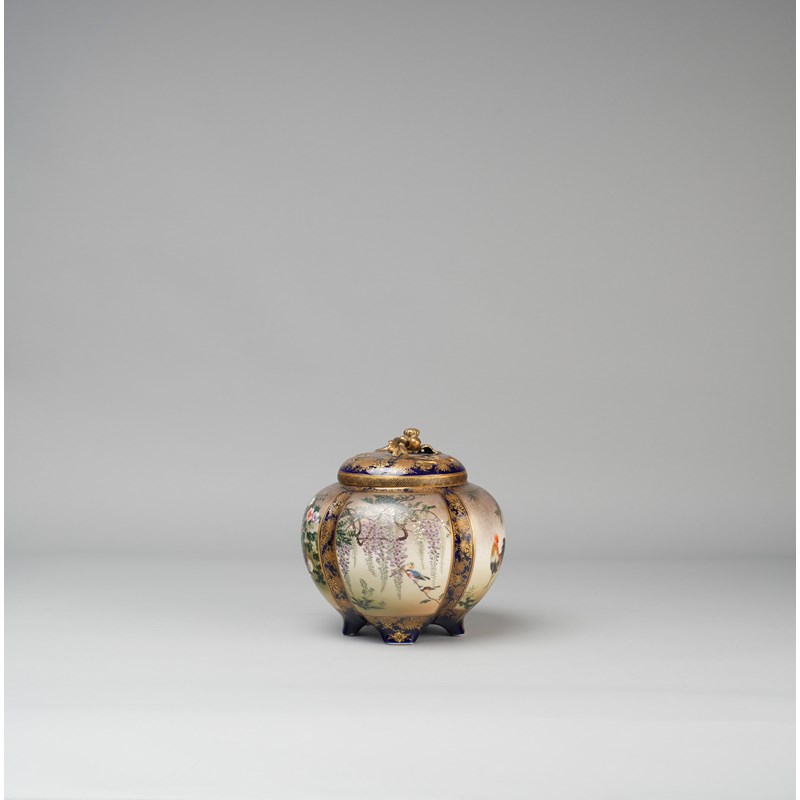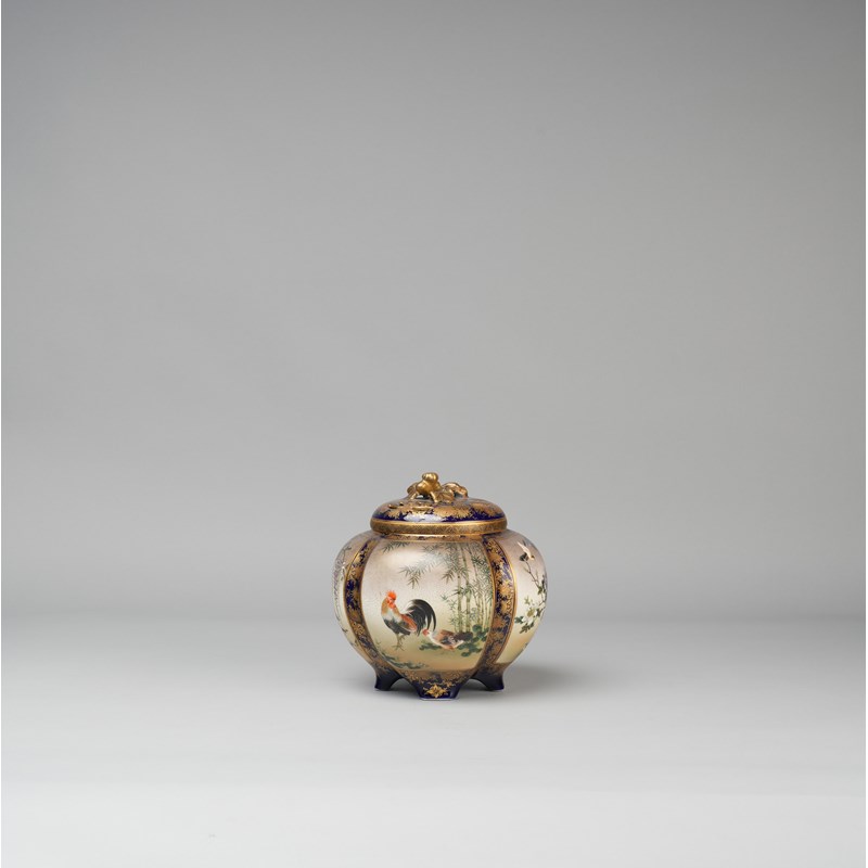 The lobed body raised and four short feet, richly decorated with panels enclosing various birds and flowers including chickens and geese; all reserved on a dense ground of gilt flowerheads on dark navy blue, the lid with further blooms and a knop modelled as a flowering branch of chrysanthemum; the base with a seal mark reading Kinkozan zo, 18cm. (2)