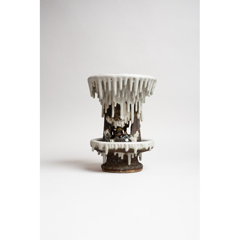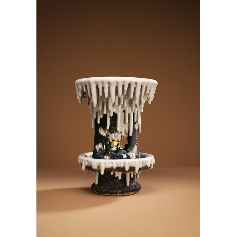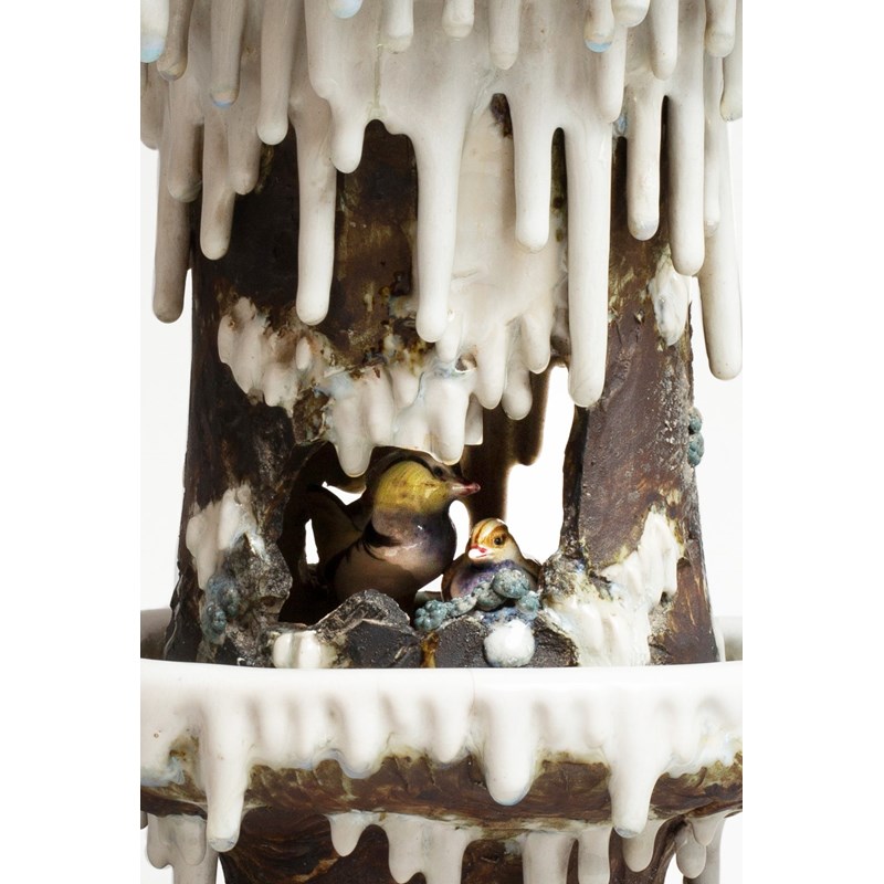 Realistically modelled in the round with two small mandarin ducks sheltering in a cave, with snow melting around them creating numerous icicles; the conical upper half with a deep recess to the top, and raised on an integral stand, the iridescent blue glaze resembling a pool around the small colourful birds; the base marked ‘Makuzu’ for the Miyagawa Kōzan workshop of Yokohama, 28cm.