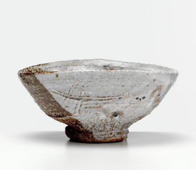 The body with rounded sides raised on a short circular foot and incised to the side, decorated with a swirling pale grey and white glaze; together with a tomobako wood box inscribed by the artist Haiyu hachi, Ryo (A bowl in ash glaze, Ryo), with the seal Ryoji no in, 15.5cm. (2)
