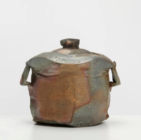 The water container with two lug handles and an undulating rim, the cover topped with a similarly uneven knop; the surface partially covered with a lustrous greenish-grey and warm iron-brown glaze, with an incised signature to the base, 22cm. (2)