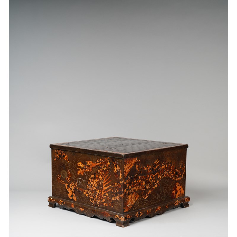 Of square shape with a typical grid to the top, richly embellished to the sides with a large dragon and a phoenix amongst scrolling clouds, all rendered in tortoiseshell and twisted wire inlays on the warm gold lacquer ground; with a shaped apron decorated with leaves, fruits and auspicious symbols, 30.5cm x 48cm x 47.5cm.