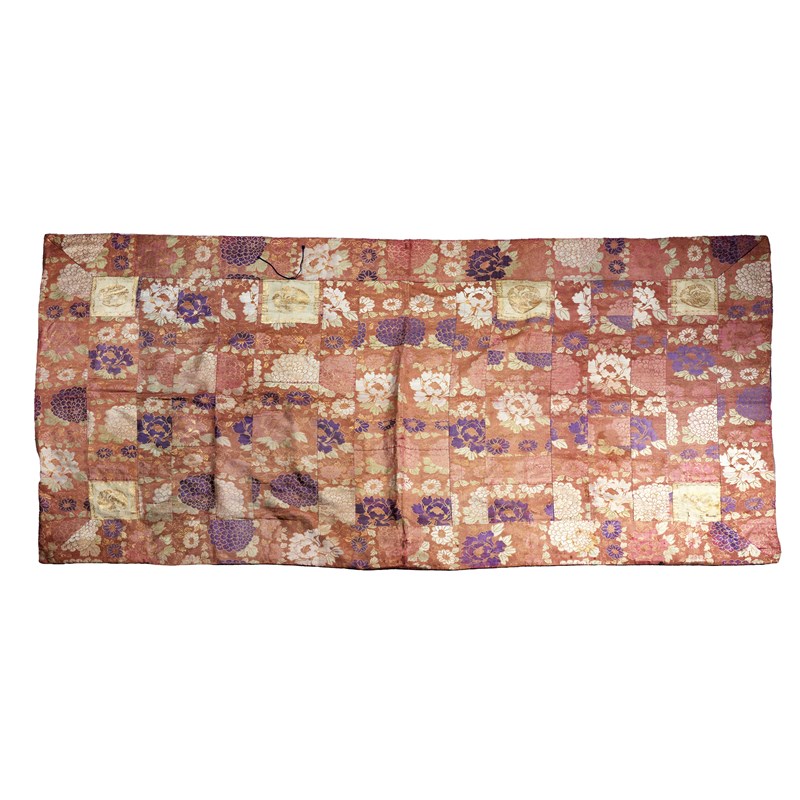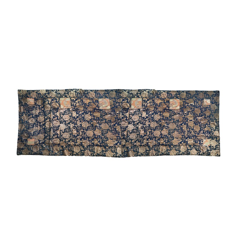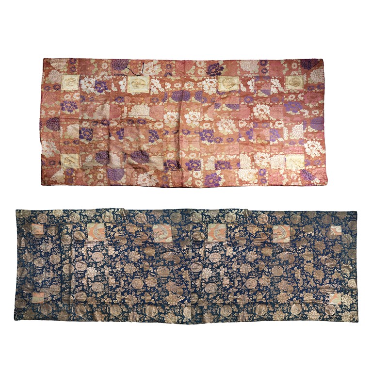 The Buddhist vestments typically made from textile fragments; one with gold chrysanthemum on a blue ground, with small orange square panels including part of a dragon amongst clouds; the other with colourful peonies on an orange ground, with squares enclosing floral roundels, 108cm x 201cm and 113cm x 204cm respectively. (2)
