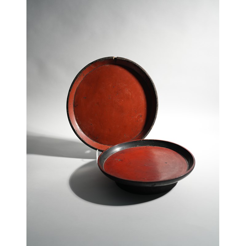 Typically decorated in red lacquer over a black undercoat; each with an everted rim, the koban raised on a high slightly splayed foot; 34.3cm and 38cm. (2)