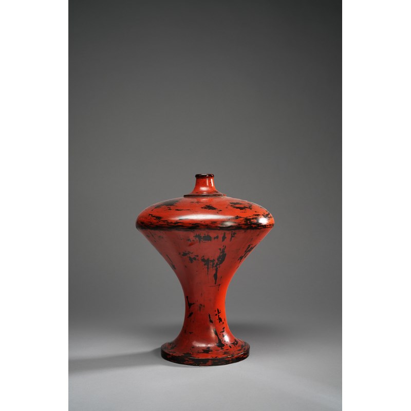 Of typical form, with a tapered neck, a broad shoulder raised on a narrow foot and a wide base, painted in warm coral-red lacquer on a black ground, 33cm.