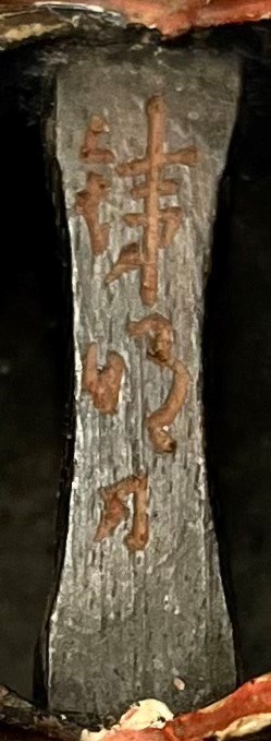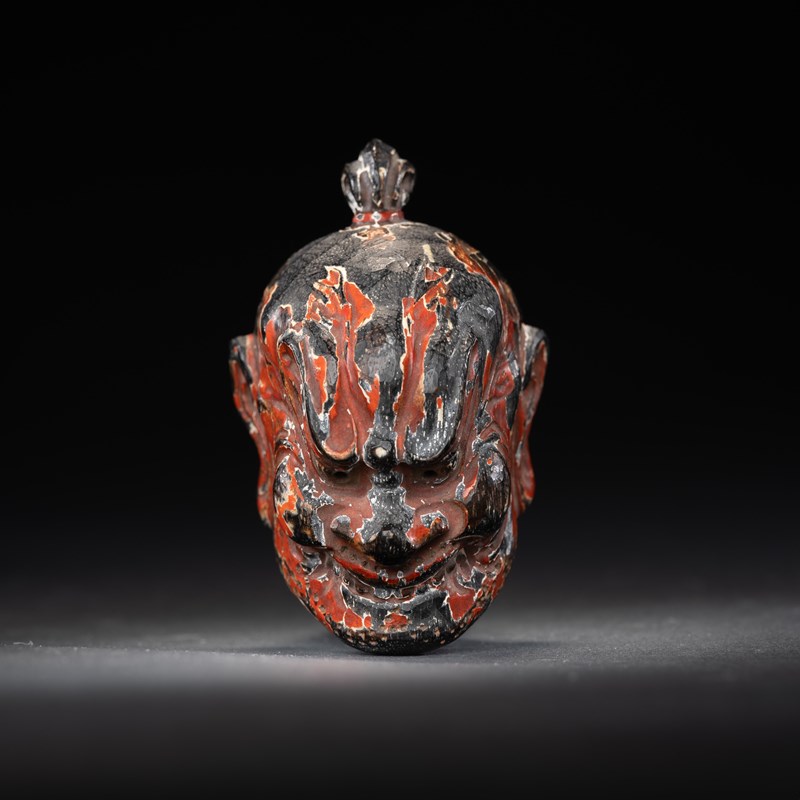 Possibly carved in hinoki (cypress wood), the surface painted in red pigment over gesso; the deity is depicted grimacing with a furrowed brow, the reverse with a three-character signature, possibly for Tessai, and an unidentified paper collection label; 6cm.