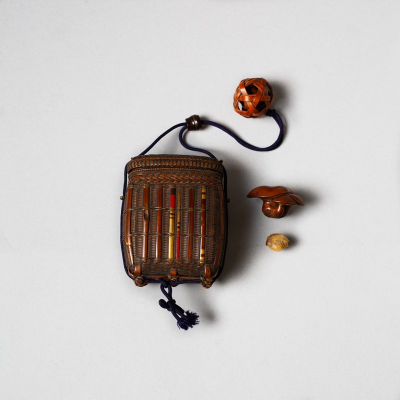 The tobacco box made of bamboo strips woven in various patterns, some stained and lacquered in red and gold, the base signed Chikuunsai zo, attached to a netsuke also made of woven bamboo with an inner ball and a bell inside; together with a wood netsuke carved as a cluster of mushrooms and a stag antler ojime modelled as a fugu fish, 9.9cm max. (3)