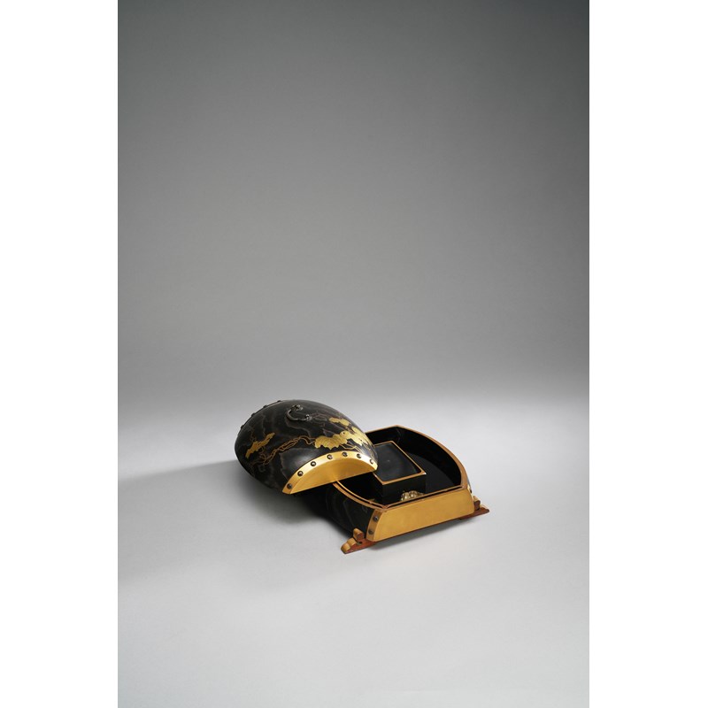 Shaped as half a war drum covered with ivy leaves and tendrils, rendered in gold hiramaki-e, kanagai, and maki-bokashi on a black roiro ground; the reverse of the lid with two chickens; two inner trays, a silver receptable for the mizusashi and a rectangular ink stone to the inside, 11.5cm x 18cm x 20cm. (6)