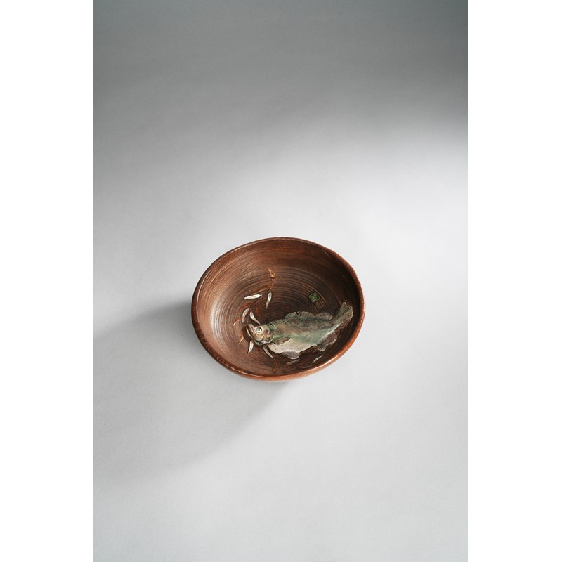 The turned bowl decorated with a large sea bass to the well, the fish realistically rendered in porcelain, with a willow branch beside it in gold lacquer and mother of pearl; a green porcelain Kan seal mark above, 19.6cm; together with a tomobako (wood box). (2)