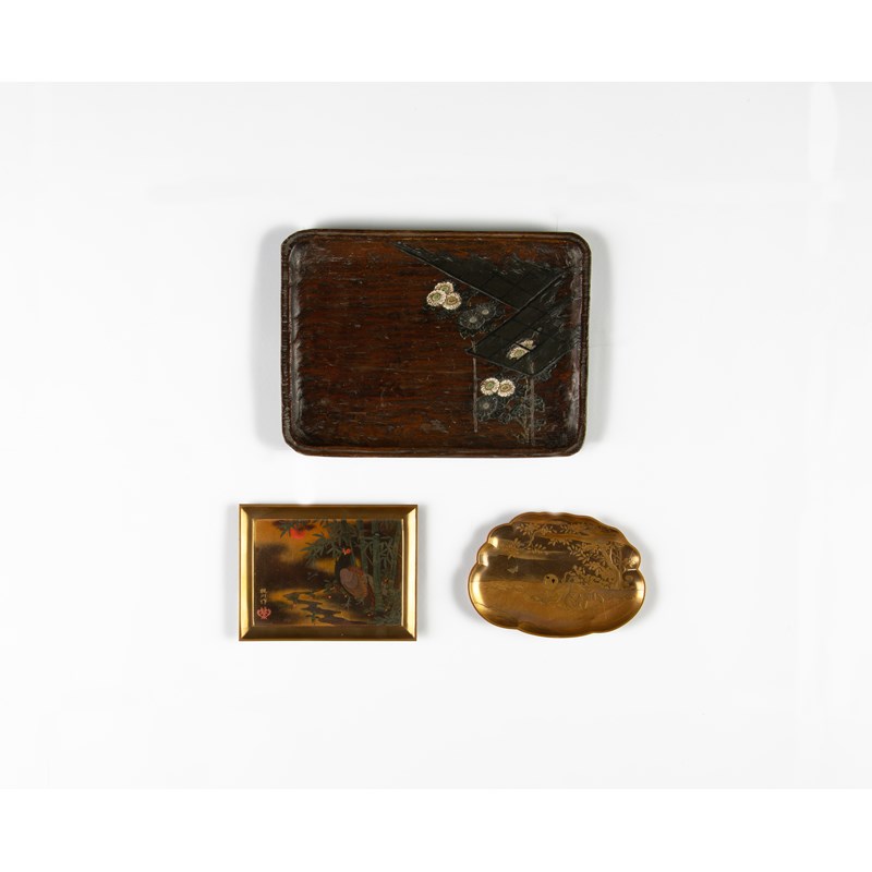 The largest of rectangular shape and decorated in the style of Ritsuō, with chrysanthemums rendered in mother of pearl, ceramic and lead; the reverse with a minute green porcelain seal mark reading as Teiji and a paper collection label for 'Tomkinson Collection 580'; the other rectangular tray decorated in iroe togidashi with a pheasant amongst bamboo, signed Kajikawa saku, the base in gold nashiji; and the third tray in the shape of Hotei’s treasure sack, decorated in gold and black hiramaki-e, togidashi, and kimpun on a fundame ground with a karako (boy) and butterfly beneath a plum tree, the reverse in nashiji, 20.6cm max. (3)