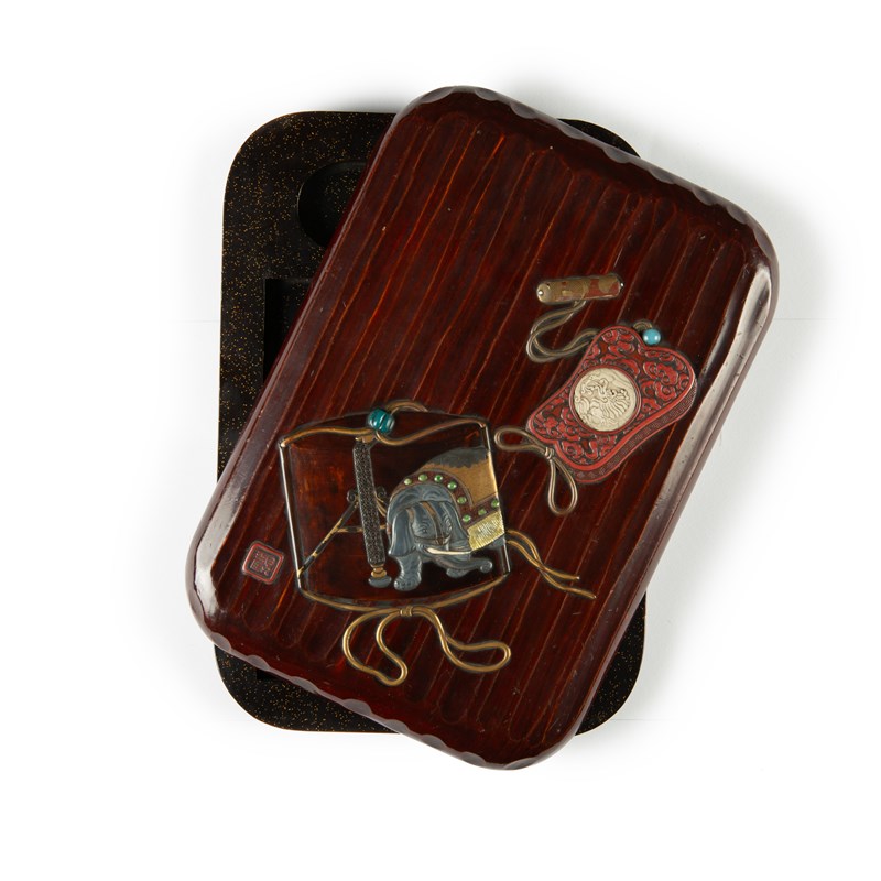The lid decorated with two inrō depicted in low relief, one with three cases and embellished with a caparisoned elephant tethered to a pole, the other depicted in the shape of a gunbai fan, rendered in tsuishu lacquer with scrolling clouds and a central medallion with a stylised dragon, the netsuke in the shape of a small handscroll; with details masterfully rendered in a variety of materials including metal, ceramic, mother of pearl and glass; a red seal mark lower left reading as Kan; the interior embellished in nashiji and with compartments for writing implements, 26cm x 18.5cm x 3.5cm. (2)