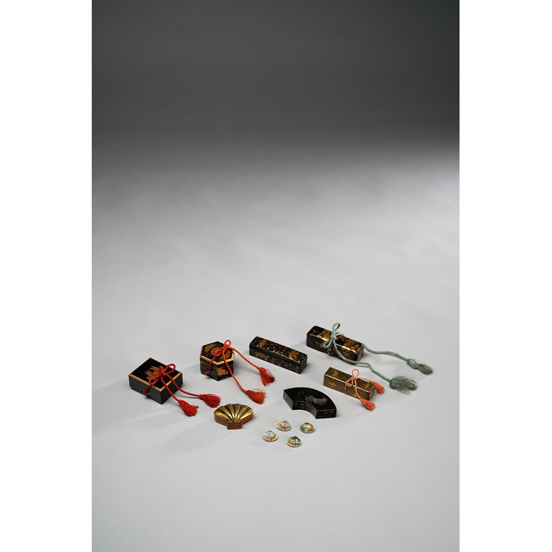 Mostly decorated in gold hiramaki-e and takamaki-e on a black roiro ground, including three models of rectangular fubako boxes and covers embellished with flowers and scrolling tendrils; a miniature model of a hōkai box and cover for the kai-awase shell game, enclosing four minute painted shells; a model of a ryōshibako (document box), the cover decorated with a fourteen-petal chrysanthemum mon and hō-ō birds; and a seashell box and cover decorated in gold, iroe hiramaki-e and gold foil on a roironuri ground; and a fan-shaped box in Somada style, decorated with kirikane and aogai inlays on a black roiro ground, with a boy sat between a basket of flowers and a large ox, a poem above; 8.5cm max. (18)