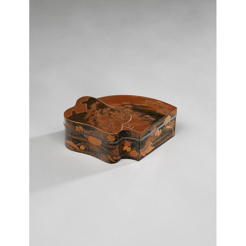 Modelled in the shape of a gunbai and another fan, decorated all over in gold hiramaki-e, nashiji and kirikane; the gunbai richly decorated with bamboo and pine and the other fan with thatched pavilions by a lake; the sides with a large number of auspicious emblems scattered across the surface, including Dailkoku's mallet, Hotei's sack of treasures and a hagoromo (a tennin's feather coat); the interior and base embellished in nashiji; 5.2cm x 15.2cm x 9cm. (2)