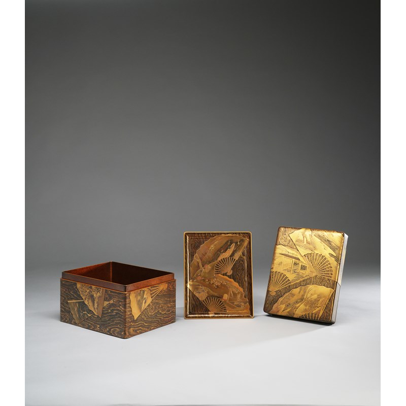 The tall rectangular box with a flush-fitting lid and inner tray, all exquisitely decorated in gold and silver hiramaki-e, nashiji, kirikane and iroe hiramaki-e with a complex design of fans scattered on a mokume ground realistically simulating wood grain; each fan embellished with a different design, one with thatched huts by a lake, another with a bird perched on a fishing boat, a third with a large ox-drawn cart; two with luxurious verandas and others depicting lush gardens and flowers, several details referencing the Tale of Genji; the base of the box and reverse sides of the lid and inner tray in nashiji; 15.5cm x 20.5cm x 25.5cm. (3)