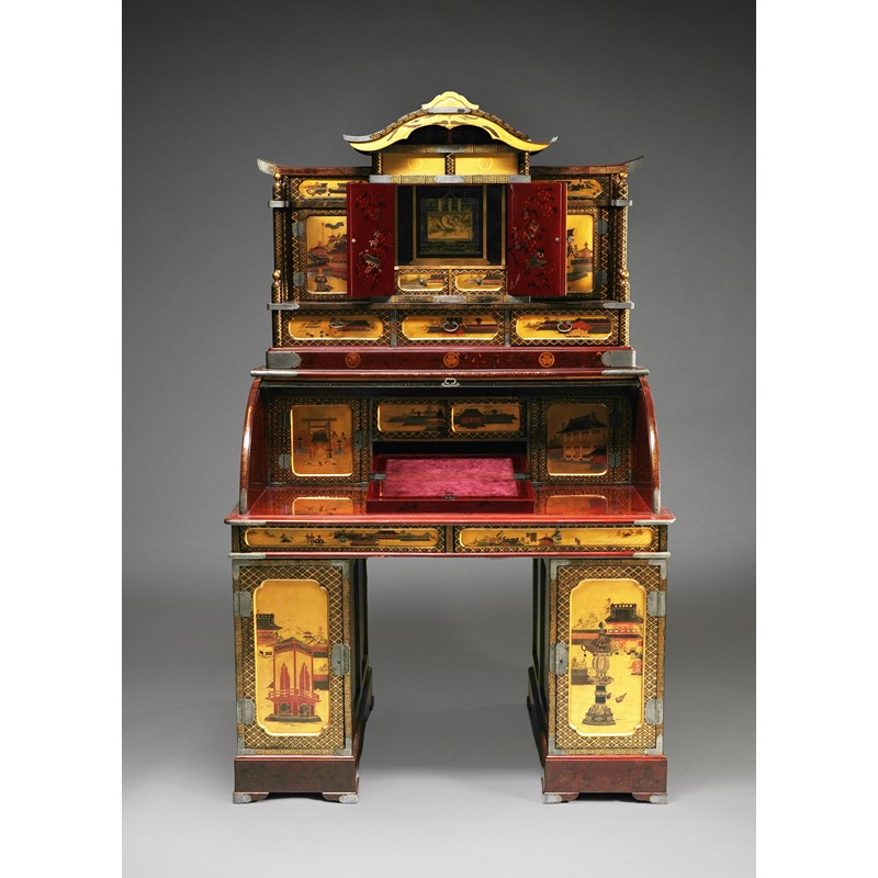 Richly decorated in mother of pearl inlays, gold and iroe hiramaki-e lacquer, painted with many view of shrines including the Nikkō Tōshō-gū, birds, paulownia and hollyhock mon, blossoming prunus trees and figures, all framed by borders of key fret and other geometrical designs; made of various stackable parts, raised on two sections with front doors each opening to reveal three drawers to the front and a cupboard to the back; the cylinder roll top enclosing two hinged doors, a set of sliding doors and a drawer containing a writing slope set in purple velvet; the superstructure reminiscent of a traditional Japanese shrine, with further doors, drawers, and a central set of hinged doors opening to reveal two small drawers and an empty space above, decorated at the back with a Japanese scroll painting with a writhing dragon, signed; 171cm x 106cm x 69cm.