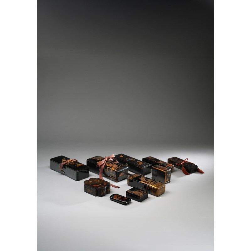 Comprising six fubako (letter boxes), a kogo (box for incense), a card case, a foliate-shaped box, and a tall rectangular box with two compartments for playing cards; all variously decorated with birds, flowers, brocade patterns and landscapes, one fubako with a silver moon crescent above sprays of bush clover by a meandering stream, another with large chrysanthemum behind trellis, 31cm max. (19)