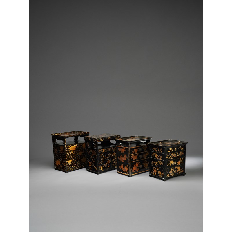 Three with a flat tray to the top, all with drawers of various sizes and decorated in gold hiramaki-e on a black roiro ground, variously painted with sprays of flowers, scrolling tendrils, and one with mon; all with metal fittings; 37.5cm x 31.5cm x 21.5cm max. (18)