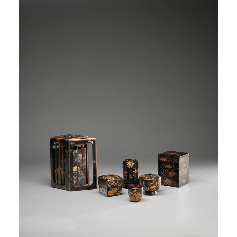All variously decorated in gold hiramaki-e, kirikane and nashiji on a black roiro ground, comprising: a jubako (picnic box) modelled as a bamboo cage covered with butterflies, enclosing three trays and a rectangular container, with details rendered in iroe hiramaki-e and gold leaf; four variously-shaped boxes decorated with flowers and scrolling tendrils, some with mon, one with four tiers and another with a domed cover raised on an associated stand; and a small natsume (tea caddy) with many cranes in flight above pine, 24.2cm max. (25)