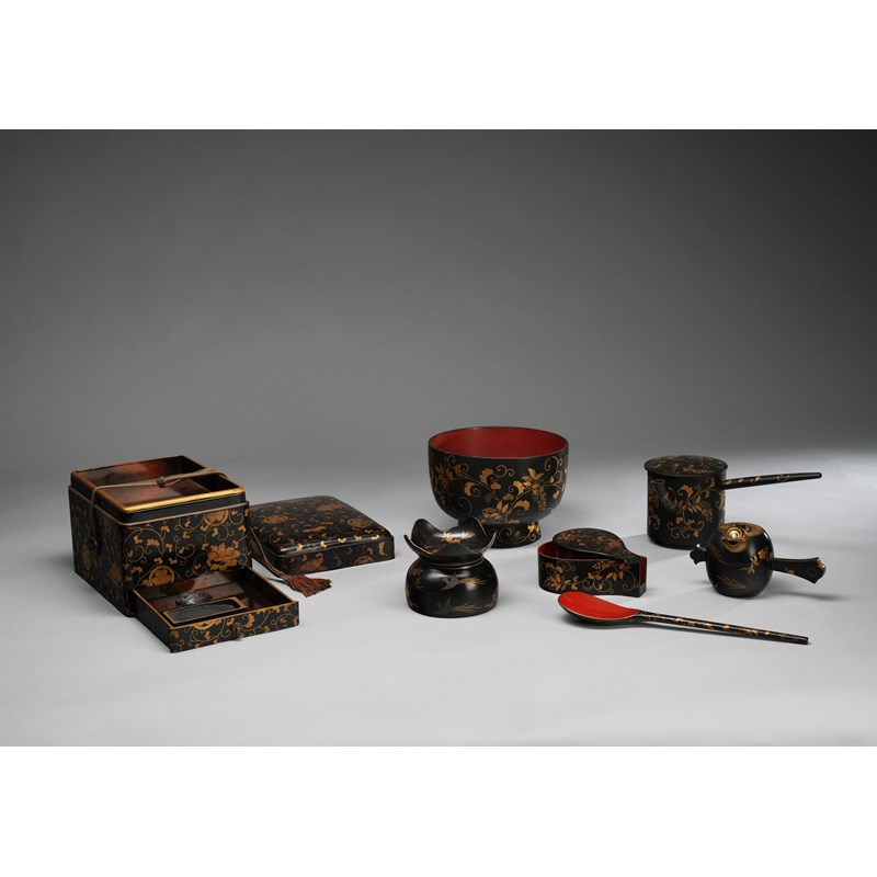 Decorated in gold and silver hiramaki-e on a black roiro ground, some with areas in red lacquer; most decorated with scrolling leafy tendrils; one a combined bunko and suzuribako, the tall rectangular box with an inner tray and a drawer opening to reveal an ink stone and a shell-shaped copper suiteki (water dropper), embellished with mon and tendrils; a large renge spoon, with a fitted case and cover to protect the bowl; a cylindrical kettle with a long straight handle and lid; a box, cover and integrated cup stand decorated with cherry blossoms and ho-o birds in flight, together with a small kettle and cover shaped as Daikoku's mallet, with the same decoration; and a large footed bowl with scrolling wisteria, 25cm max. (18)