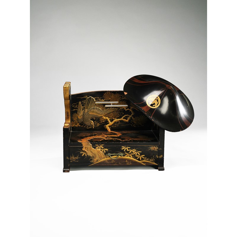 The stand in gold and silver hiramaki-e on a black roiro ground, decorated with a large bird of prey and a pine tree before Mount Fuji, above a single drawer; and the gold, red and black lacquer jingasa with a single circular mon enclosing a ho-o bird; 44cm max. (3)