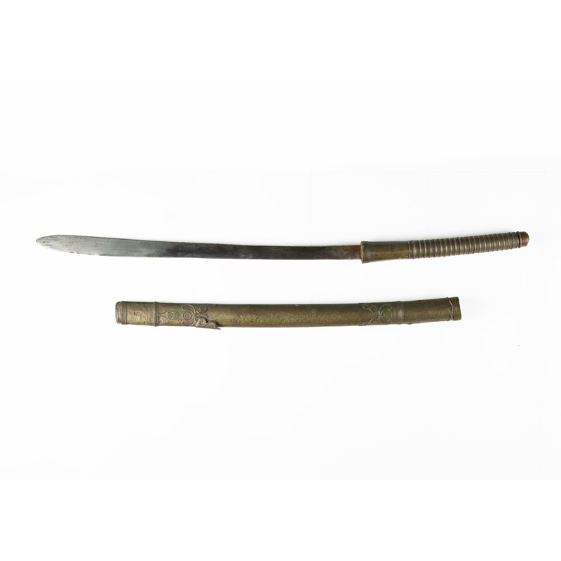 Possibly a dha sword from Thailand or of Ainu origin, the handle and scabbard covered with metal sheets decorated with scrolling ornaments, the blade 47.5cm, 74.5cm overall. (2)
