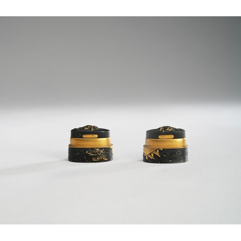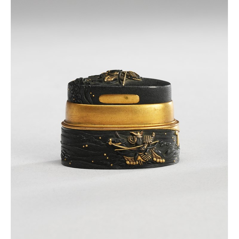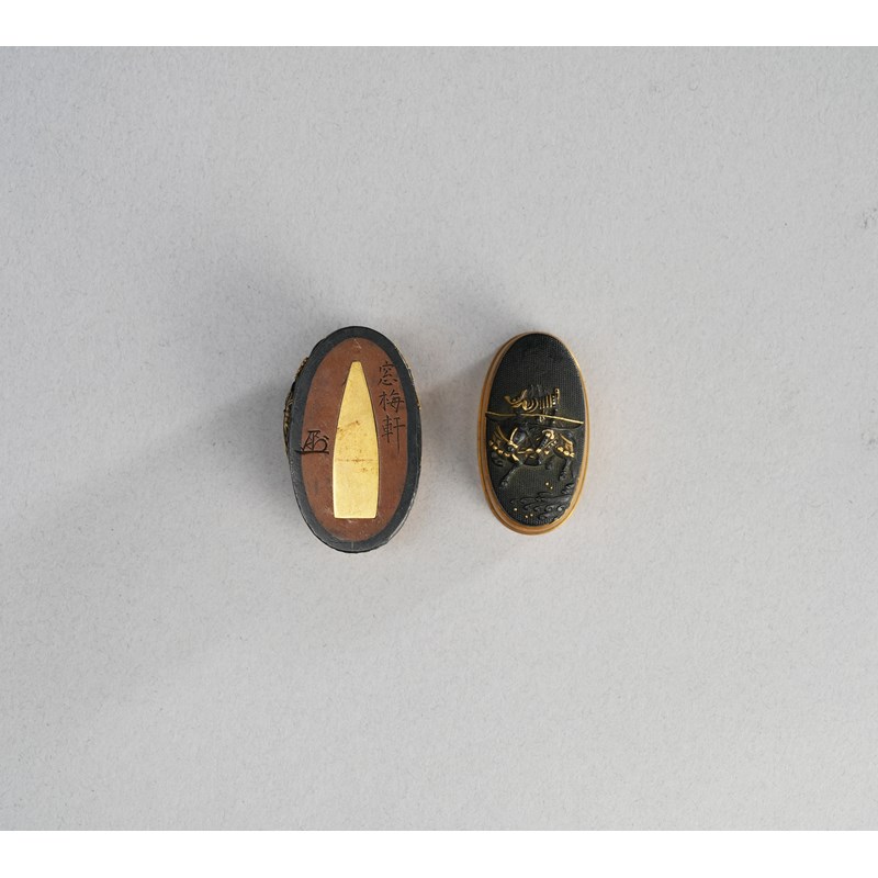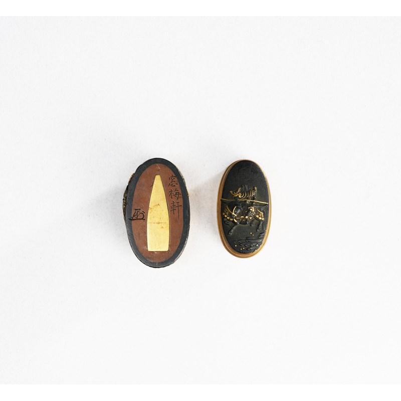 Made up of a fuchi and kashira, decorated with scenes from the Tale of the Heike, with Kagesue riding his black horse Surusumi and his rival Takatsuna riding Ikezuki, one armour-clad samurai crossing the Uji river on the kashira and riding by the shore on the fuchi, signed Sobaiken and with kao, 3.9cm. (2)