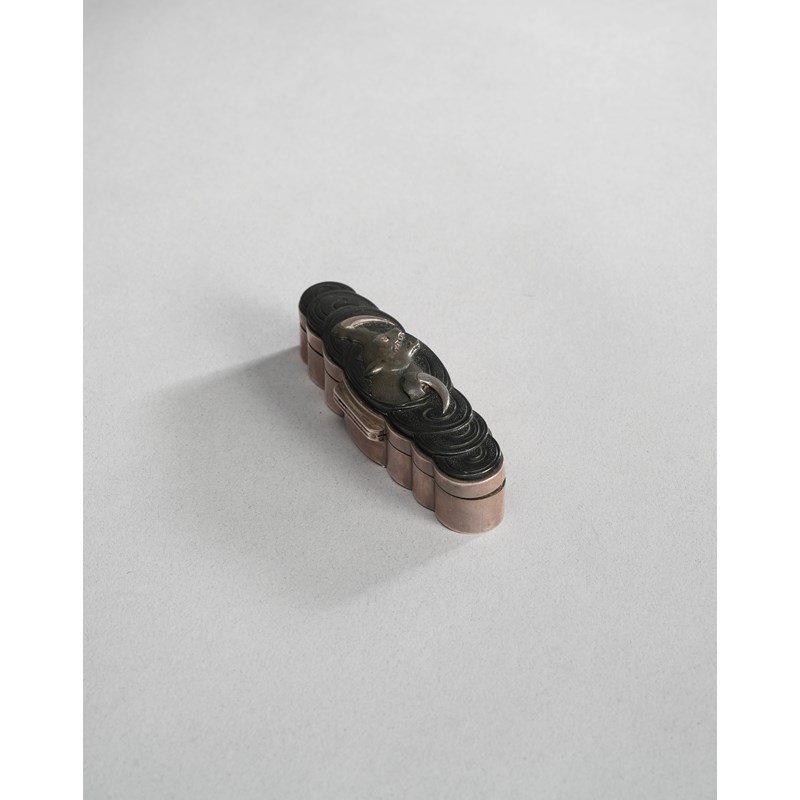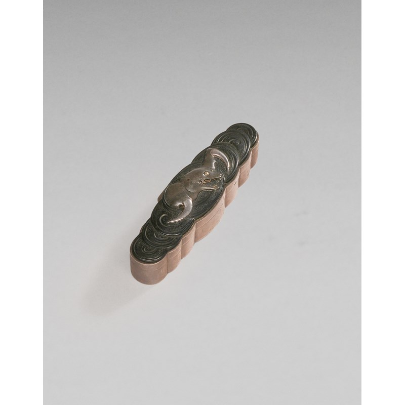 The top inset with a plaque depicting a kamaitachi ('sickle weasel'), the fury beast with sharp silver claws emerging from scrolling clouds in shakudo, its eyes and fangs picked out in gilt; mounted in a silver box of the same shape with English hallmarks for George Heath, London 1895; 8.8cm.