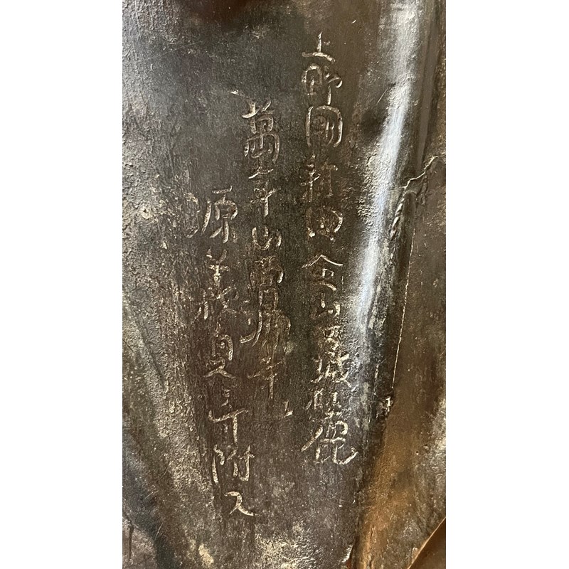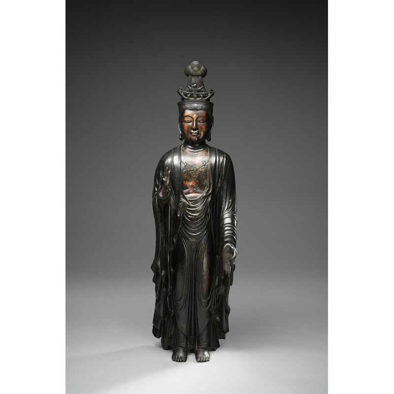 The impressive and heavy Bodhisattva of Compassion depicted standing, barefoot and with long flowing robes revealing her chest, with bejewelled necklaces with malachite inlays and an elaborated headdress; the hands depicted in kichijo-in and an-i-seppo-in; with a long inscription at the back reading as 'Kozuke no kuni, Nitta, Kanayama jo sanroku, Mannen san Sogen-ji, Minamoto Yoshisada kufu su' (Donated by Minamoto Yoshisada, the Sogen-ji Temple of the Mannen mountain, located at the foot of Kanayama Castle, Nitta, Kozuke Province)', 95cm.