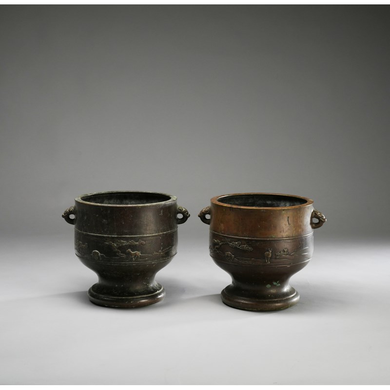 A NEAR PAIR OF JAPANESE BRONZE JARDINIERES