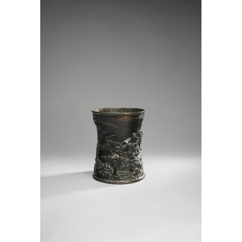 Of tall waisted shape, decorated in relief with an unusual scene set in Buddhist Hell, with the horse and ox-headed demons Mezu and Gozu overseeing the infernal landscape, a stream meandering beside them amongst jagged rocks and scrolling mist; the reverse with a man carrying a large stele of the Buddhist Triad over his back; unsigned, 25.3cm.