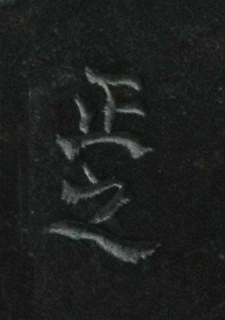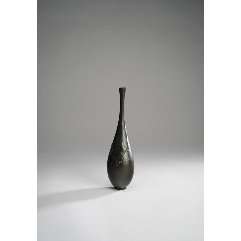 Of tsuru-kubi (crane’s neck) shape, the tall slender body cast in low relief with a small bird perched on a flowering branch of prunus, the base signed Masatsugu, 26cm.