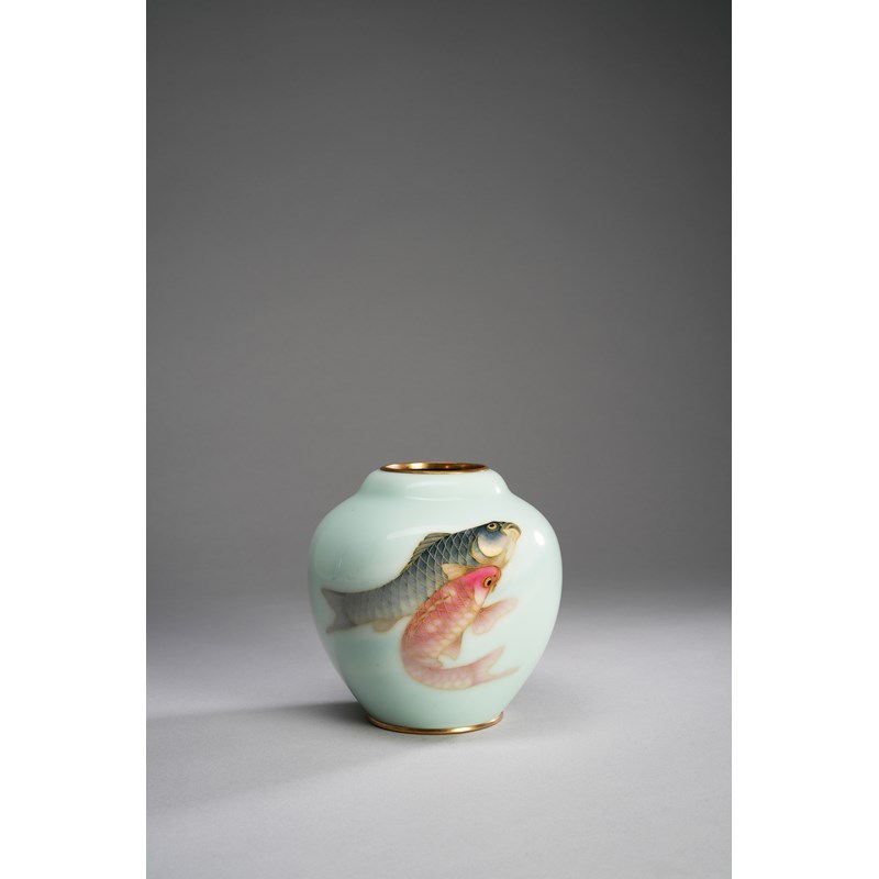 The globular body with a rounded lip, delicately decorated in gold wire and musen (wireless) coloured enamels, with two carp swimming on a pale green ground, with the Ando trademark in gold wire to the base, 15.5cm.