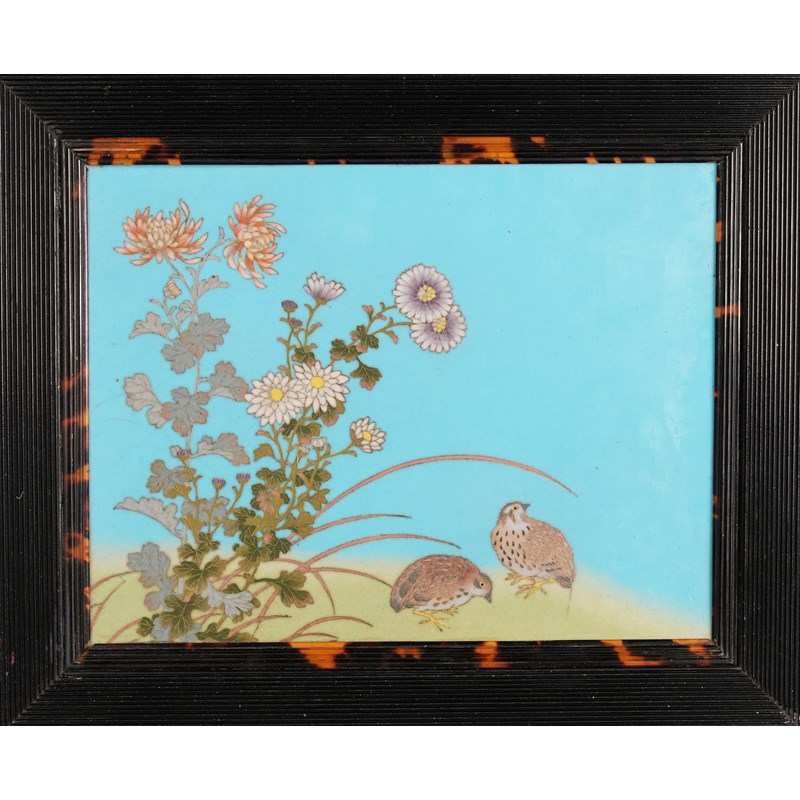 Of rectangular form, with two small quails underneath flower sprays on a bright blue ground, the reverse with fish scale pattern; mounted in a frame with tortoiseshell border, the panel 13.7cm x 17.8cm, 19.2cm x 23.2cm overall.