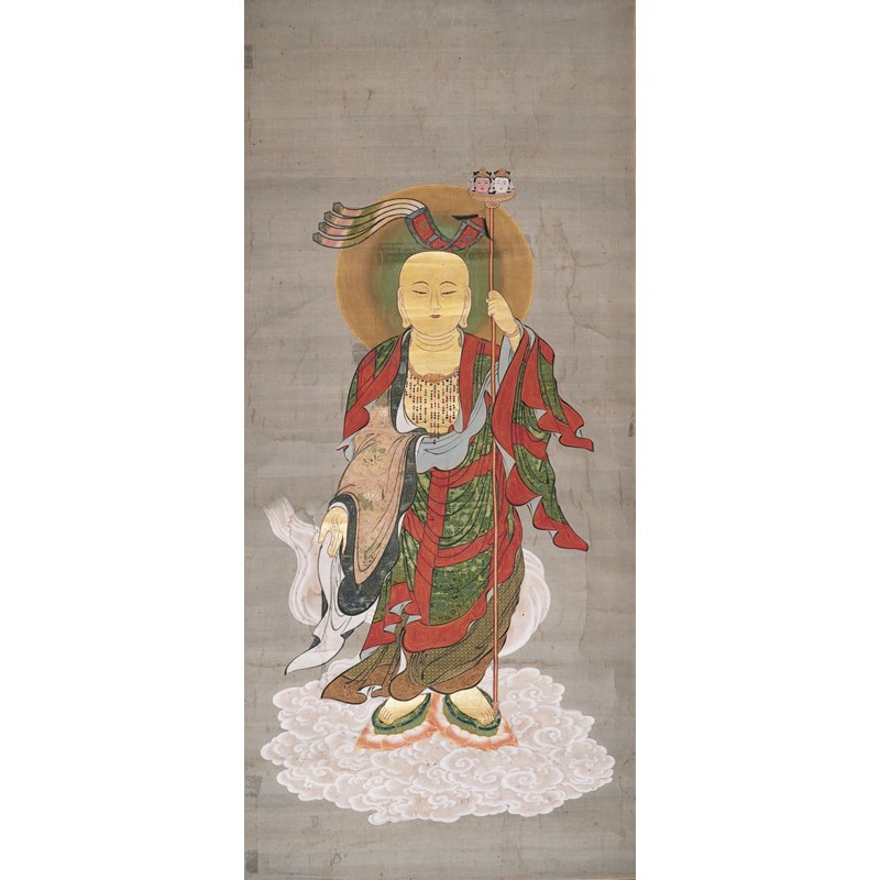 A Japanese kakejiku (hanging scroll painting), in ink, colours, and gold on silk, the Buddhist Protector of children depicted descending from the heavens, holding a staff topped with two deities' heads; with an ornate beaded necklace and dressed in monastic robes, raised on a double lotus pedestal and scrolling clouds; 98cm x 42cm.