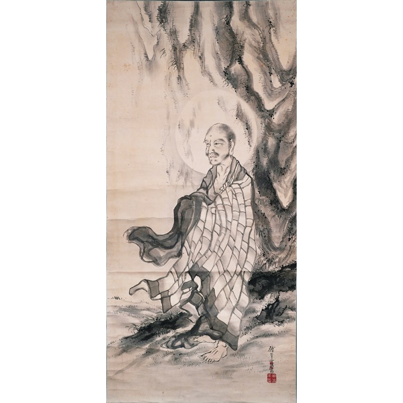 A Japanese kakejiku (hanging scroll painting), ink, gold and colour on paper, depicting the historical Buddha standing by a rocky outcrop, signed Shuko Saiki utsusu and sealed Nishizaki Kizan, Shuko and Nishizaki Chikara (Ryo) in; 125cm x 59cm.