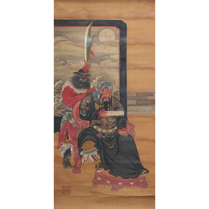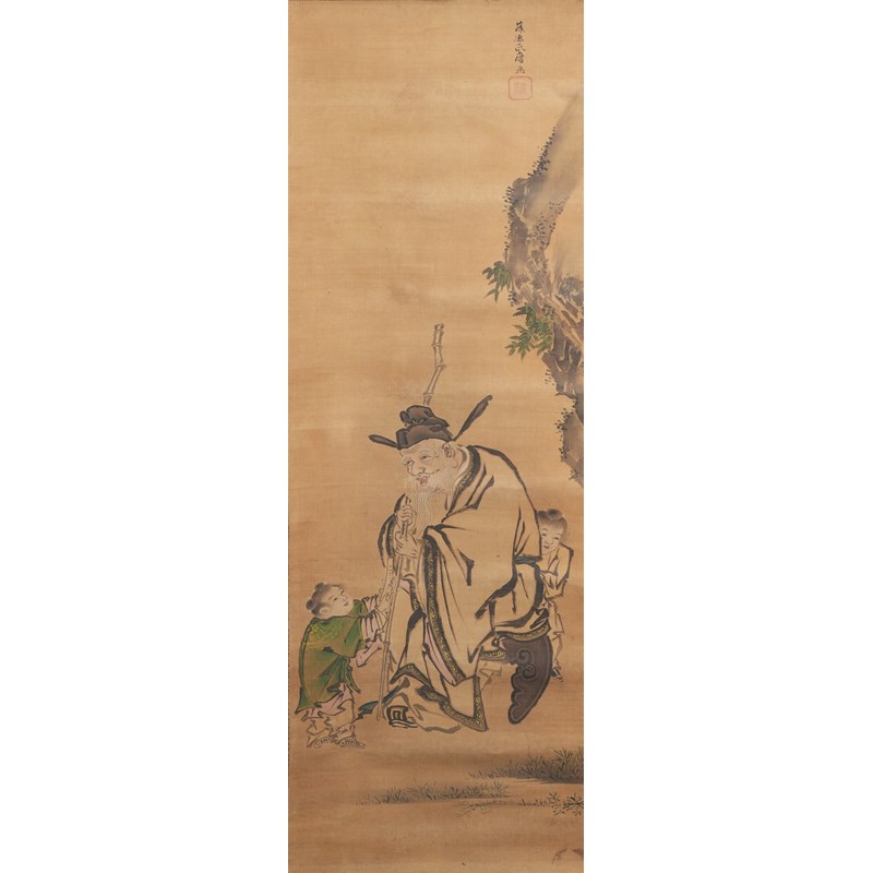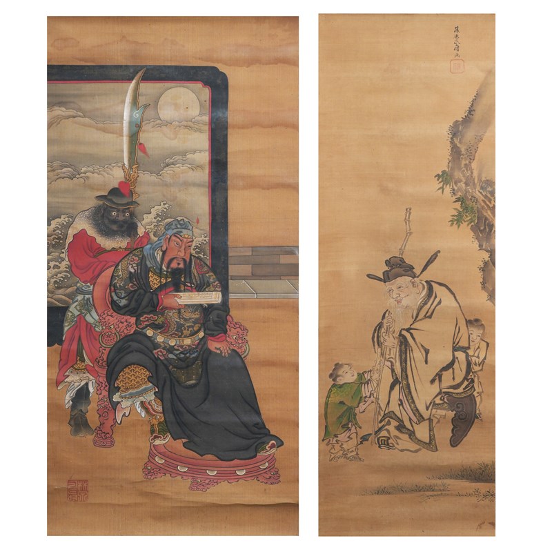 A Japanese kakejiku (hanging scroll painting), ink and colour on silk, depicting the famous Chinese Tang dynasty general Kaku Shigi or Guo Ziyi (697-781) as an elderly man with children, signed Fujiwara Ujitsune ga and sealed Fujiwara, 108cm x 36.5cm; together with a scroll painting of Kan'u and Chohi (Guan Yu and Zhang Fei), with a seal reading Rinsen juin (Auspicious seal of Rinsen), 86cm x 42cm. (2)