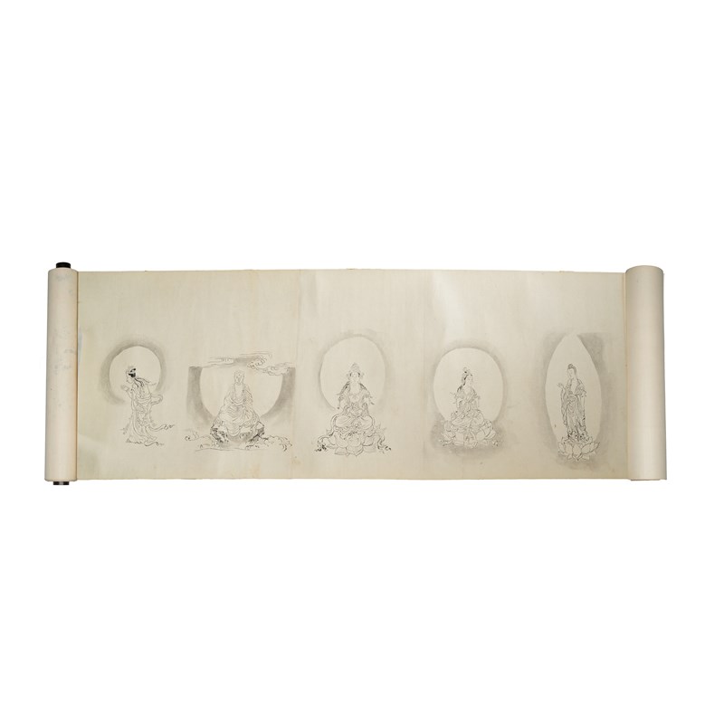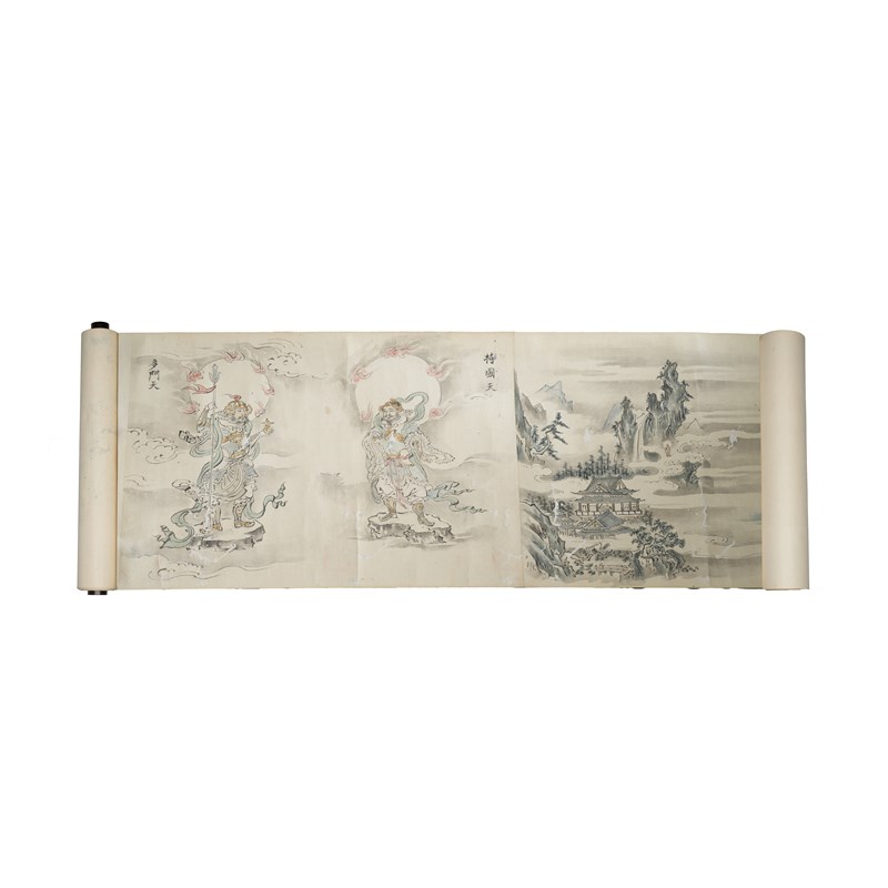 Two Japanese makimono (handscroll paintings), ink and colour on paper, each with depictions of Buddhist and Shinto deities, one scroll starting with views of Earth and Heaven followed by divine beings, each accompanied by an inscription with its name; 26cm x 419cm and 22cm x 495cm. (2)