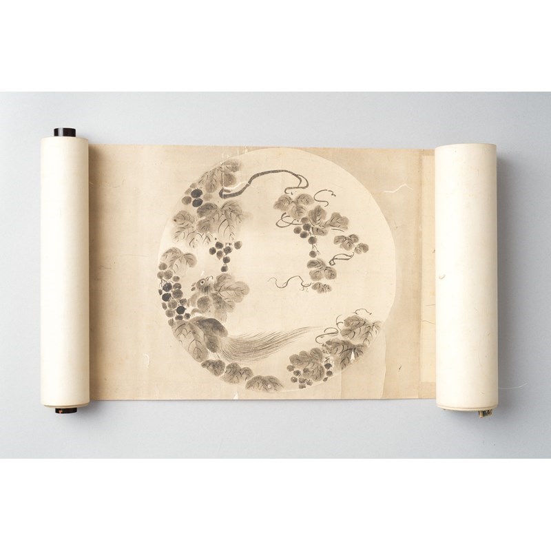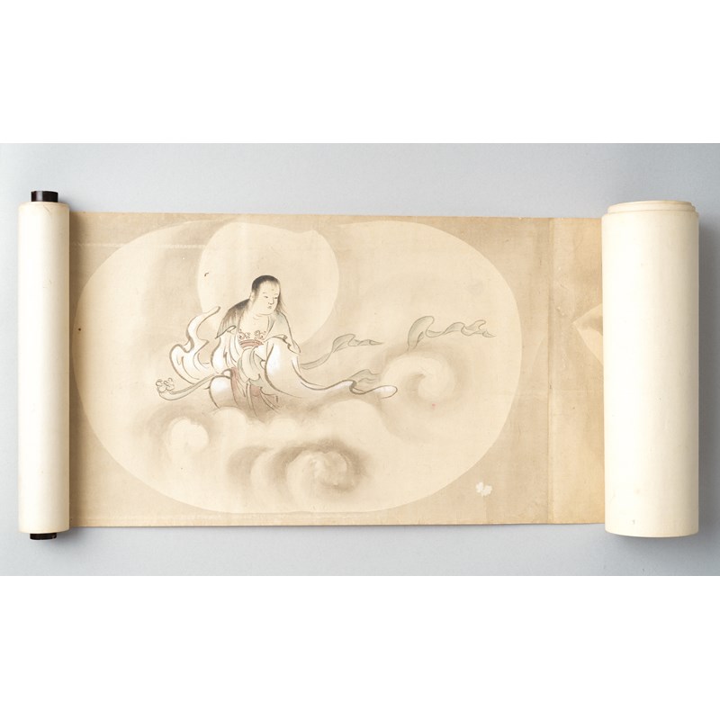 A Japanese makimono (handscroll painting), ink and colour on paper; the scroll is painted with a large number of fans of different sizes, variously enclosing depictions of figures, landscapes, birds, flowers and other subjects. 27cm x 610cm.