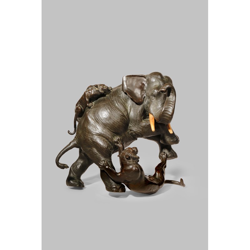 The pachyderm fending off the attack of two tigers, one clambering upon its back and the other clawing at its leg, with ivory tusks and inscribed on its belly Seiya zo for Genryusai Seiya, 39.5cm wide.
