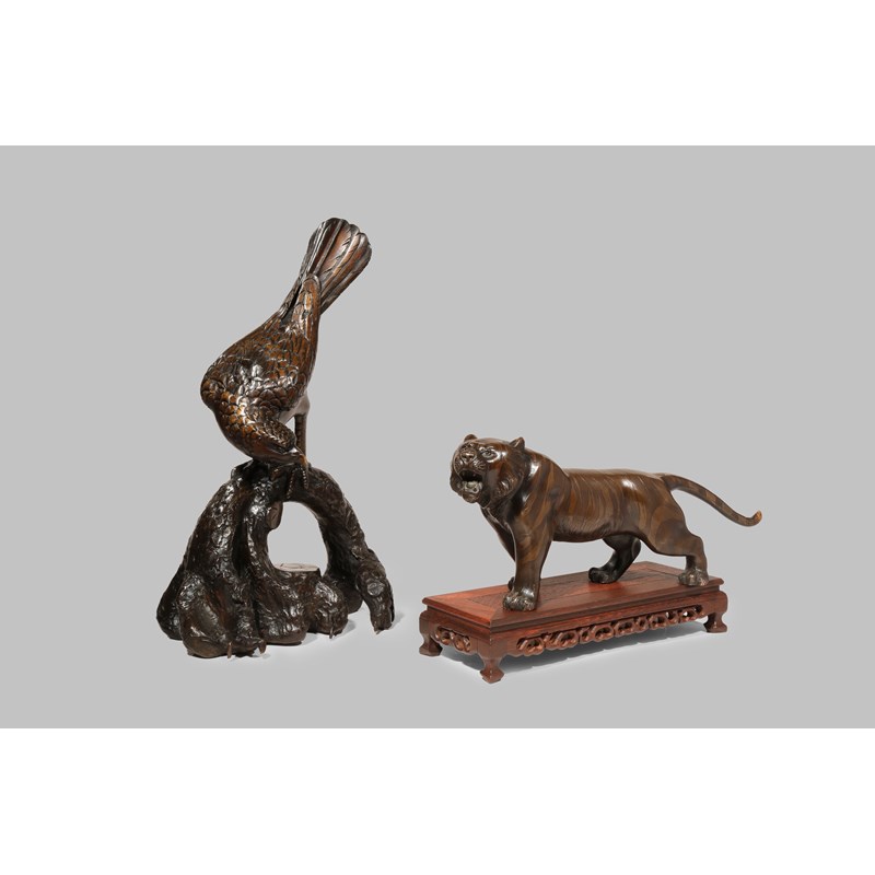 One cast as a tiger standing four-square with its mouth open in a snarl, with a rectangular wood stand and signed Ikko to the belly, the other depicting a bird of prey perched on a tree stump, the feathers on its back opening to form a lid, unsigned, 34.5cm max. (3)