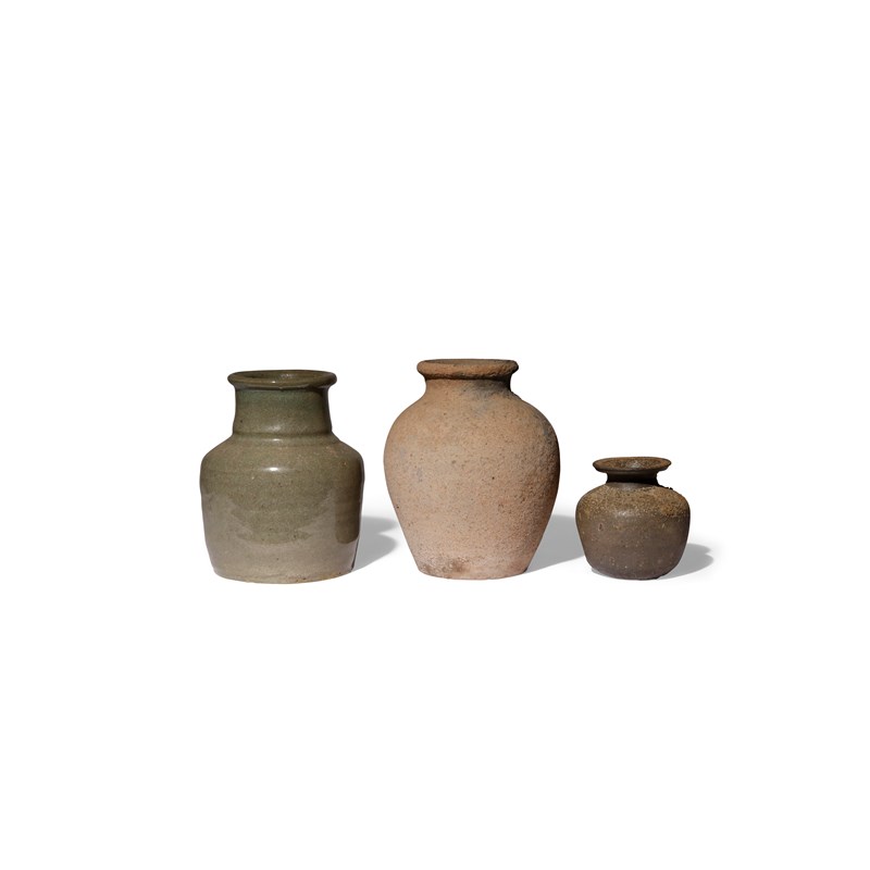 One with a lustrous olive-green glaze, the two others with a rough unglazed surface, 21.5cm max. (3)